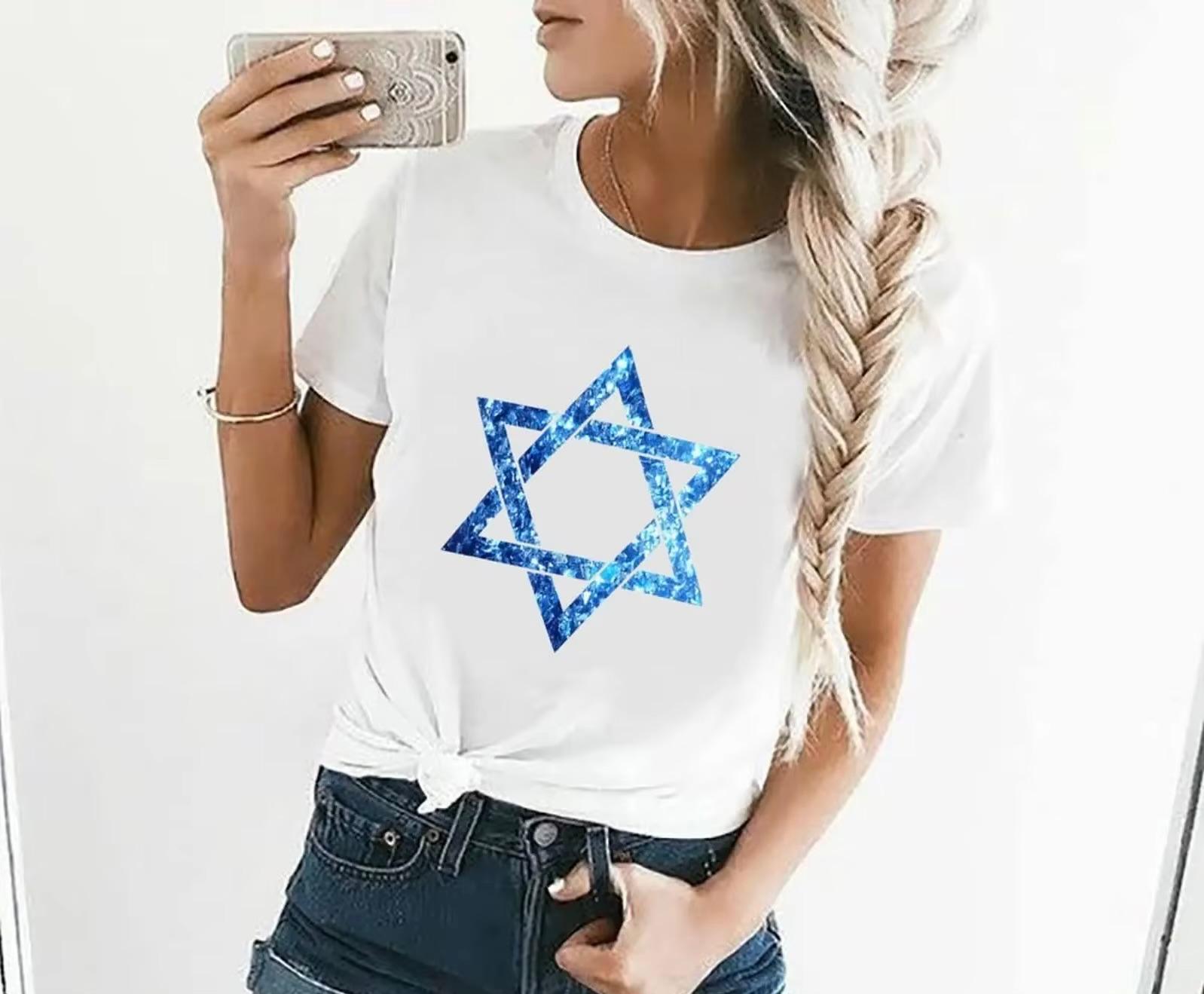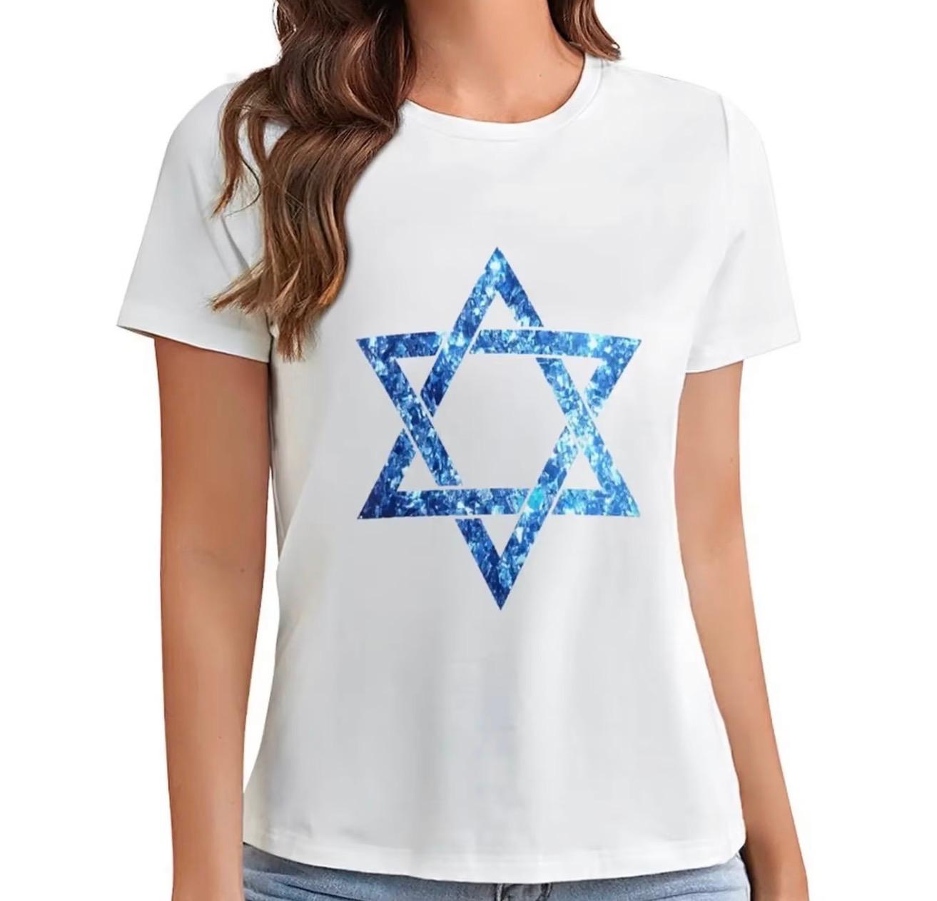 Camiseta feminina em malha especial de algodão + Poliéster, macia e confortável, com estampa da Estrela de Davi. Um toque de estilo e significado para quem valoriza a identidade e a elegância do maior símbolo judaico ✨