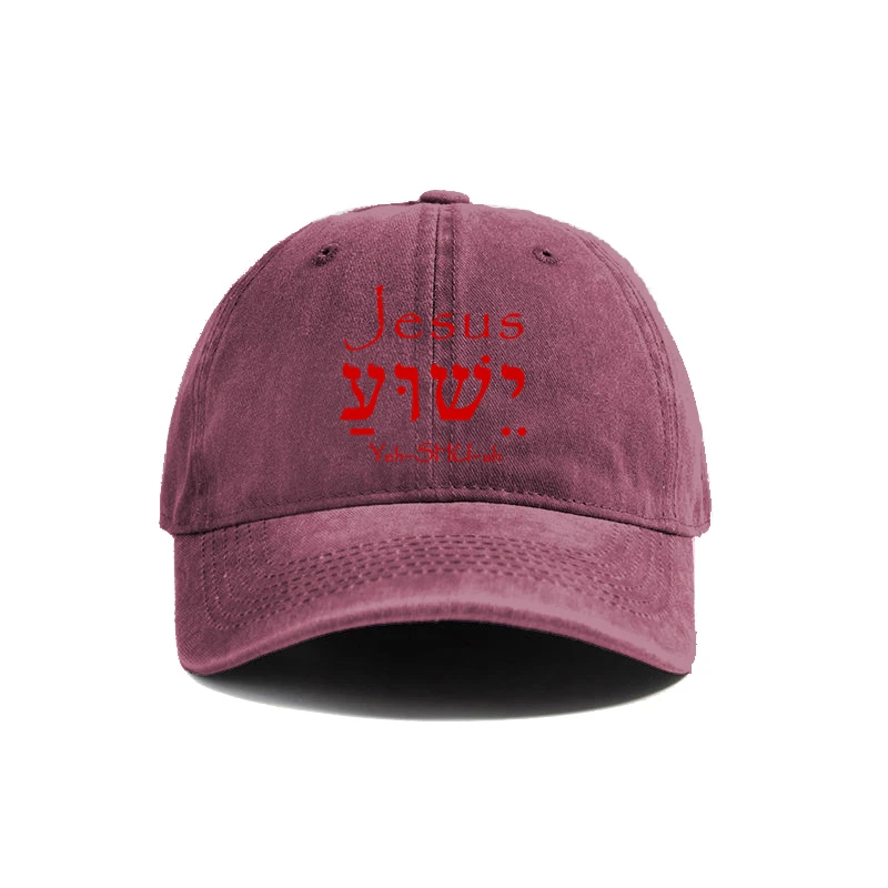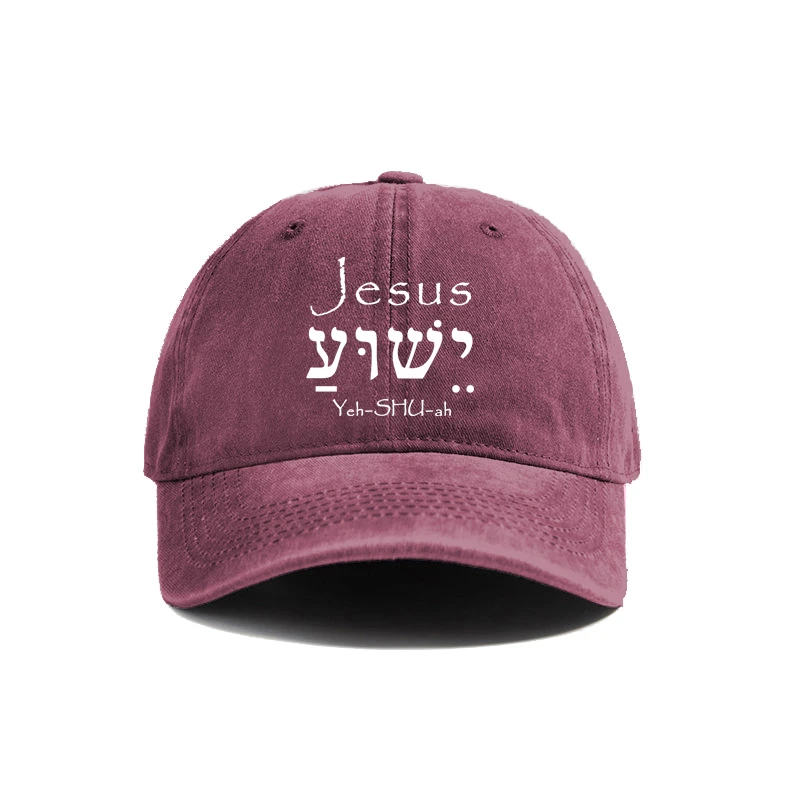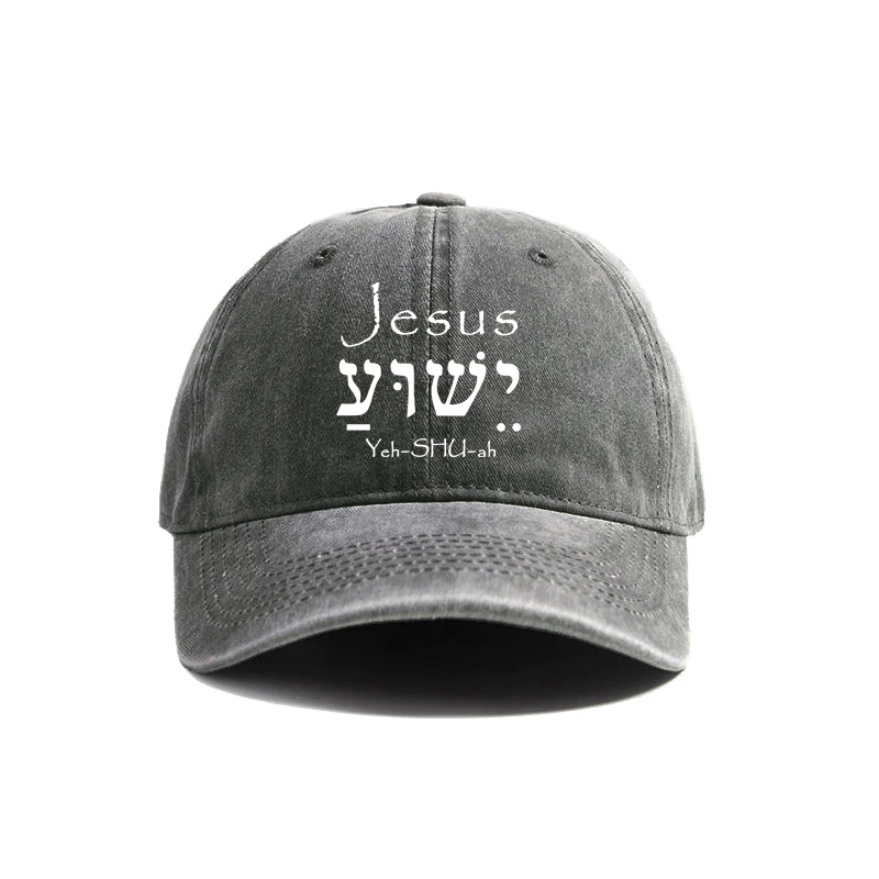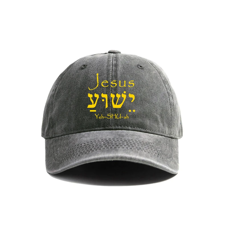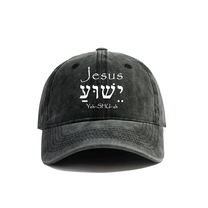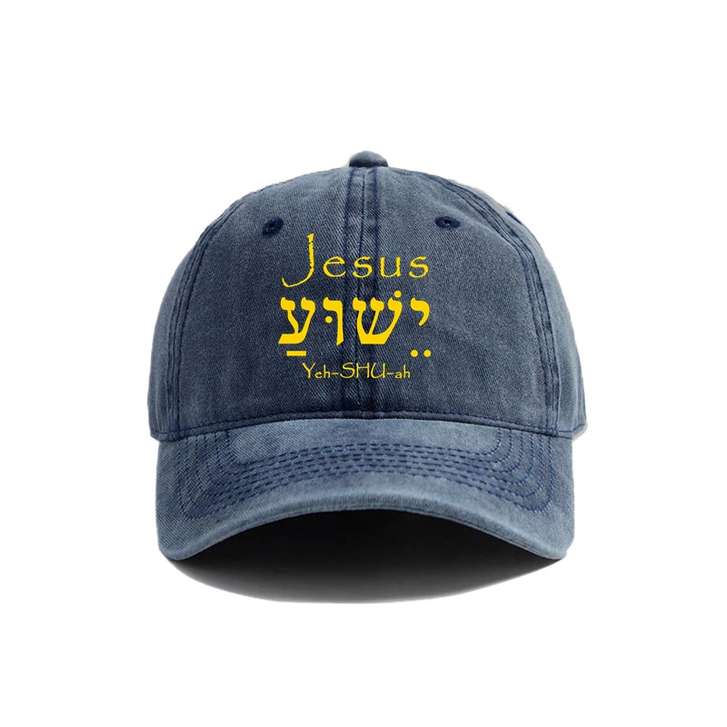 Bonés unisex com estampa JESUS em português e hebraico, de poliester e algodão "estilo jeans", com costura reforçada. Disponível em diversas cores de estampa e diversas cores de bonés. - 4. tamanho: circunferência da tampa 56-59 cm, altura da tampa 13 cm